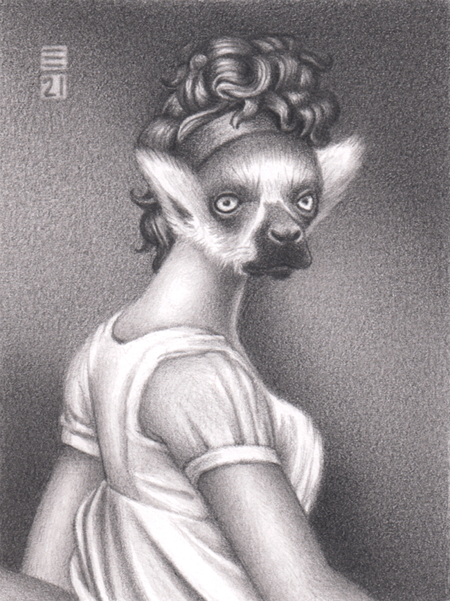 For this series of drawings, I used French Neoclassical portraits from the early 1800s as references. Graphite drawings make up the first half of the series, showing people with facial features inherited from animals, birds and insects; physical reminders that people are children of nature. These drawings envision a fictional post-Revolutionary Era utopia in which humanity reconnects with nature, as opposed to the actual historical timeline leading to the acceleration of environmental destruction and extinction.