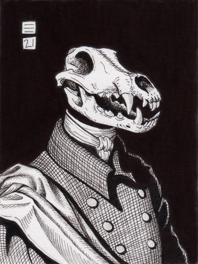 The ink drawings that make up the second half of the series feature people with animal skulls for heads that are meant to be a visual inversion of the living creatures from the first half. The people in these drawings are eternally disconnected from themselves (they're missing their human heads) as well as from nature. The skulls that they use to replace their missing heads symbolize death, and are the only relics from the natural world that these people carry with them.