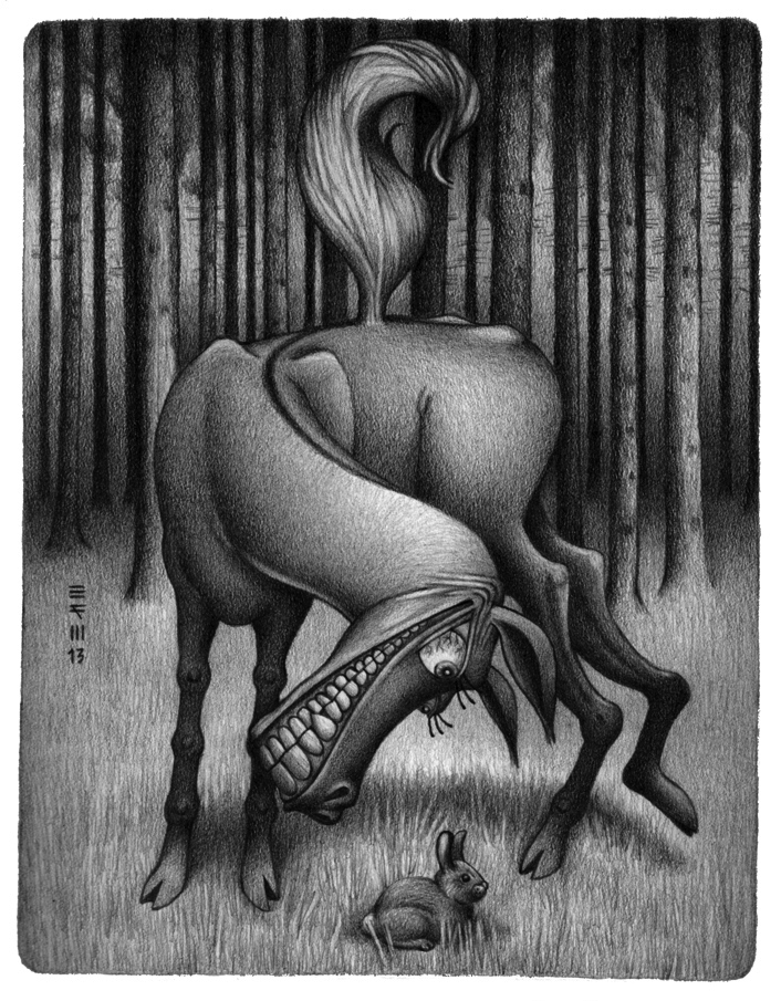 The thirteen graphite and ink drawings in this series are inspired by the medieval French folk tale about Melusine, a beautiful, mysterious woman who lives in the woods and is wooed by a man named Raymond. Melusine agrees to marry Raymond on the condition that he will let her return to her house in the woods once a week, and that he will never follow her there. Melusine gives birth to many children. Each child is born with an unusual physical attribute: one is covered in fur, another has a tusk growing out of his face, yet another is born with one eye higher on his head than the other. One day, Raymond breaks his promise and follows Melusine back to her house in the woods. As he spies on her, he sees her lower half transform into a sea-serpent tail. When Melusine discovers Raymond's transgression, she leaves him, never to return.