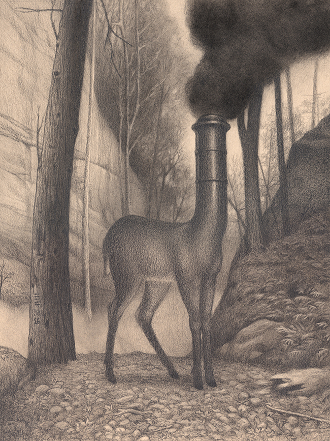 For this series of drawings, I used French Neoclassical portraits from the early 1800s as references. Graphite drawings make up the first half of the series, showing people with facial features inherited from animals, birds and insects; physical reminders that people are children of nature. These drawings envision a fictional post-Revolutionary Era utopia in which humanity reconnects with nature, as opposed to the actual historical timeline leading to the acceleration of environmental destruction and extinction.