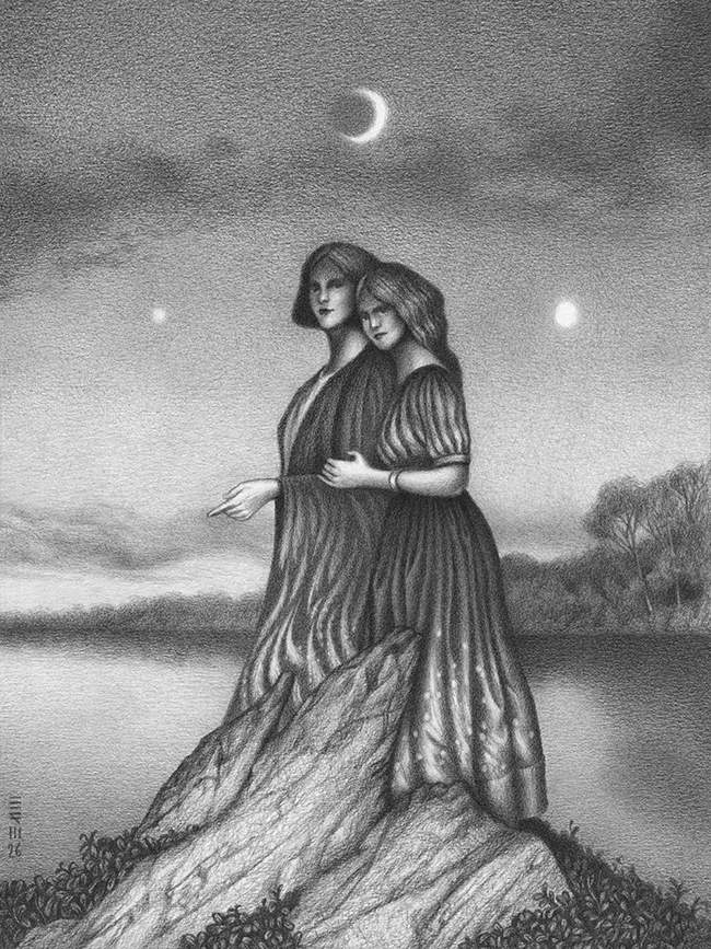 The thirteen graphite and ink drawings in this series are inspired by the medieval French folk tale about Melusine, a beautiful, mysterious woman who lives in the woods and is wooed by a man named Raymond. Melusine agrees to marry Raymond on the condition that he will let her return to her house in the woods once a week, and that he will never follow her there. Melusine gives birth to many children. Each child is born with an unusual physical attribute: one is covered in fur, another has a tusk growing out of his face, yet another is born with one eye higher on his head than the other. One day, Raymond breaks his promise and follows Melusine back to her house in the woods. As he spies on her, he sees her lower half transform into a sea-serpent tail. When Melusine discovers Raymond's transgression, she leaves him, never to return.