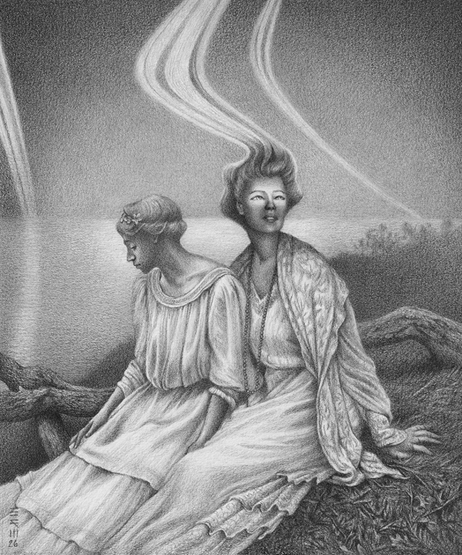 For this series of drawings, I used French Neoclassical portraits from the early 1800s as references. Graphite drawings make up the first half of the series, showing people with facial features inherited from animals, birds and insects; physical reminders that people are children of nature. These drawings envision a fictional post-Revolutionary Era utopia in which humanity reconnects with nature, as opposed to the actual historical timeline leading to the acceleration of environmental destruction and extinction.